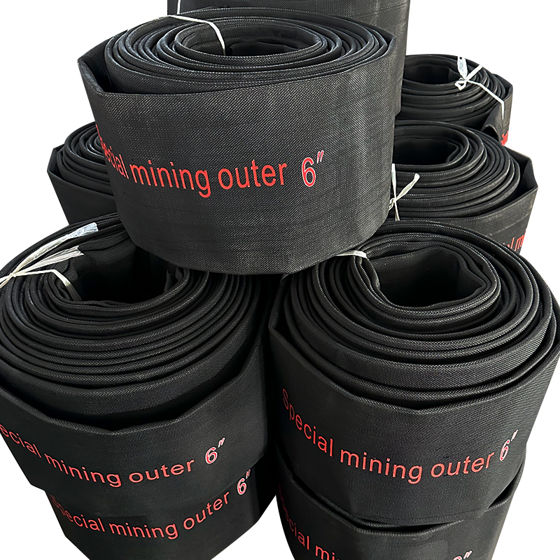 6-inch platte mijnbouwslang met Storz-connector, robuuste, slijtvaste platte slang voor externe drainage in de mijnbouw. Beschikt over snelsluitbare Storz-koppelingen en ligt plat als hij leeg is, zodat hij gemakkelijk kan worden opgeborgen.